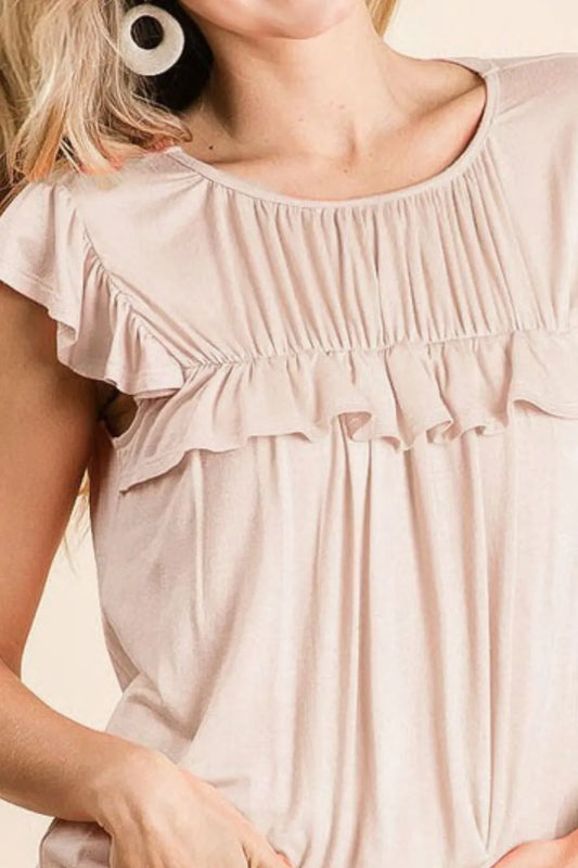 BiBi A Little Flair Jersey Knit Gathered Top with Ruffles in Gucci Oatmeal