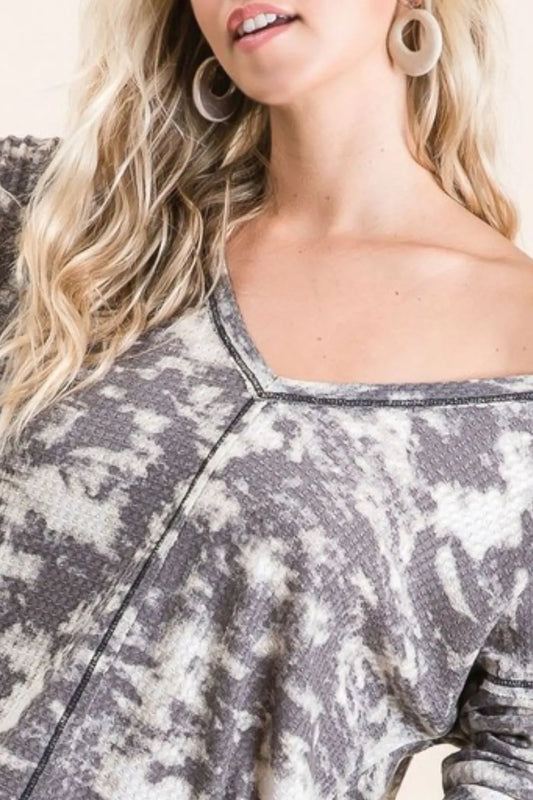 BiBi Color Splash Tie Dye Print Waffle V-Neck Top with Contrast in Charcoal