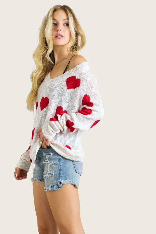 ADORA Forever And Always V-Neck Knit Top in White/ Red Heart