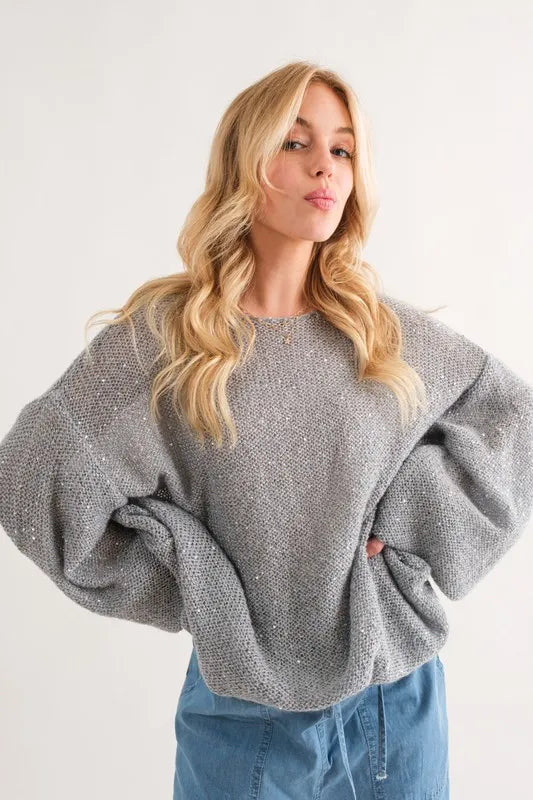And The Why Glitter On Knit Sequined Light Weight Pullover Sweater in Grey