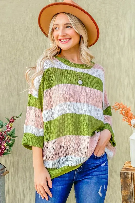 And The Why Spring Moves Multi Striped Mesh Pullover Spring Sweater in Olive