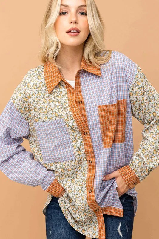 And The Why Take It Easy Floral and Plaid Color Block Shirts with Pocket in Serenity