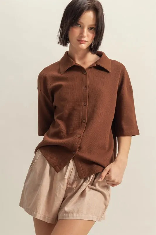 HYFVE Office Vibes Collared Neck Button Down Waffle Shirt in Chestnut