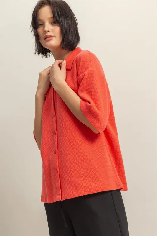 HYFVE Office Vibes Collared Neck Button Down Waffle Shirt in Coral
