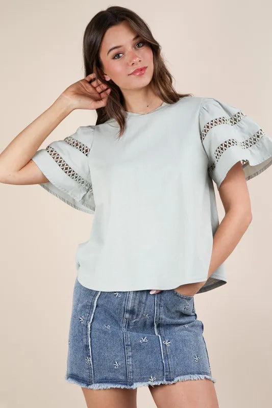 VERY J Spring Fling Lace Trim Sleeve Top in Sage