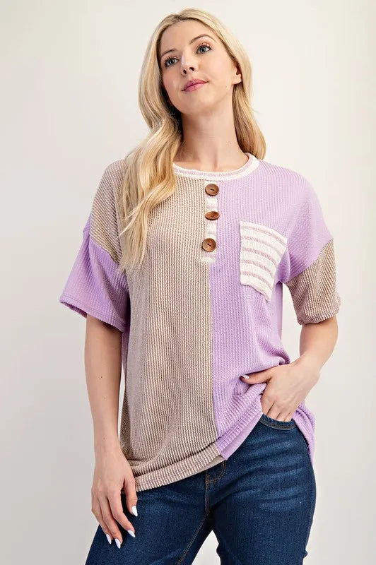 Celeste Work It Out Rib Contrast Short Sleeve T-Shirt in Lilac Stripe