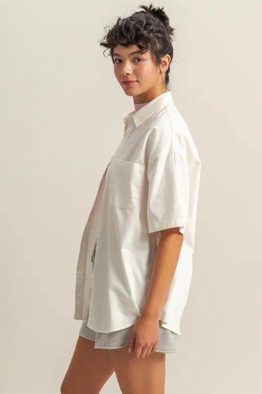 HYFVE Put In Work Short Sleeve Button Down Oversized Shirt in Cream