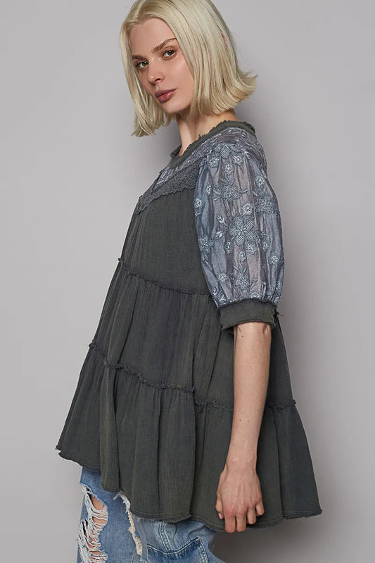 POL Lovely Lace Detail Tiered Half Sleeve Blouse in Charcoal