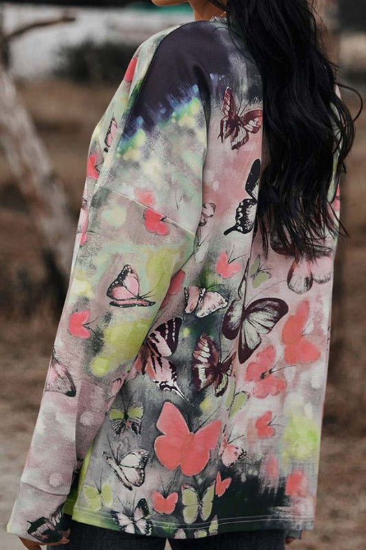 The One With Wings Butterflies Print Round Neck Zipper Front Blouse