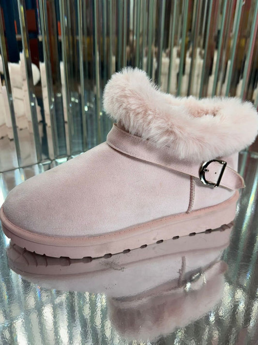 WILD DIVA Faux Fur and Fabulous Faux-Fur Buckle Round Toe Booties in Light Pink