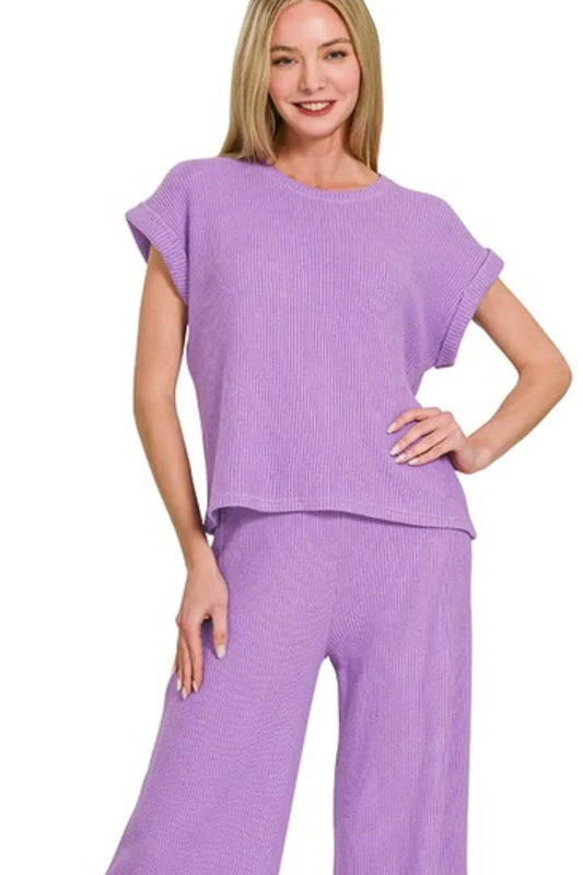 Zenana Mix It Up Rolled Sleeve Top and Pants Sweater Set in Lavender
