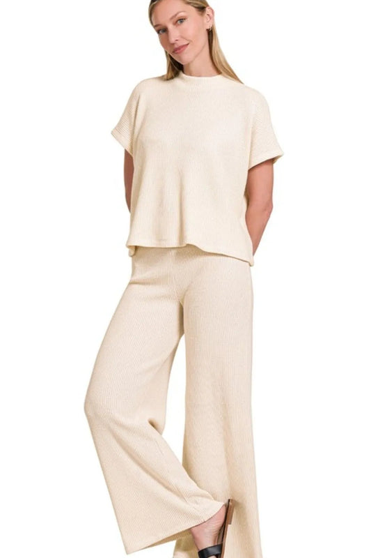 Zenana Mix It Up Rolled Sleeve Top and Pants Sweater Set in Sand Beige