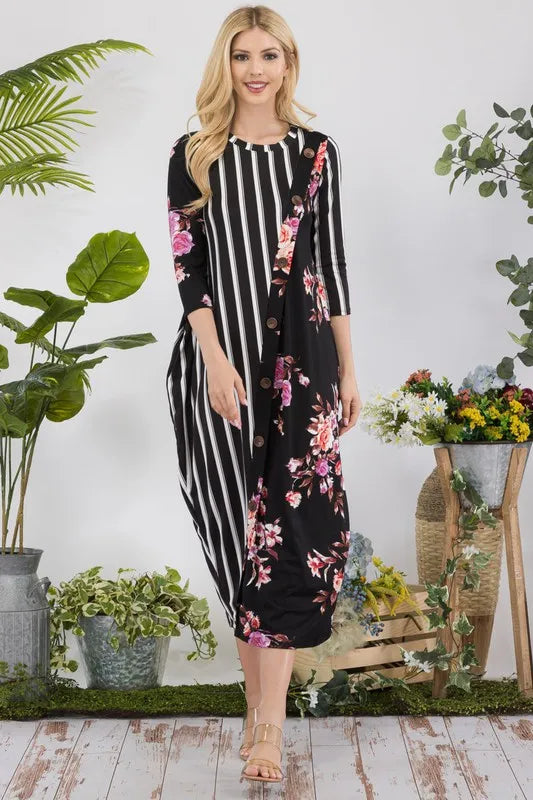 Celeste Perfect Harmony Stripe Floral Contrast Midi-Dress with Buttons in Black Floral/ Stripe