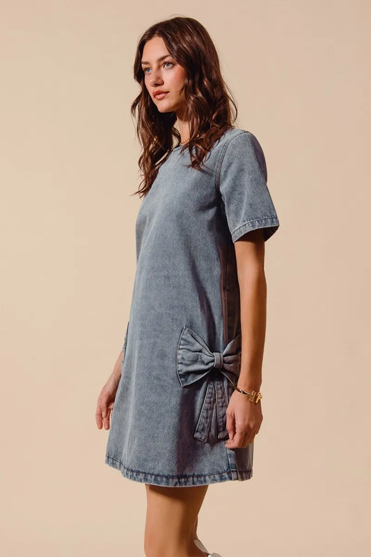 SO ME Better Days Bow Ribbon Knot Applique Denim Mini Dress