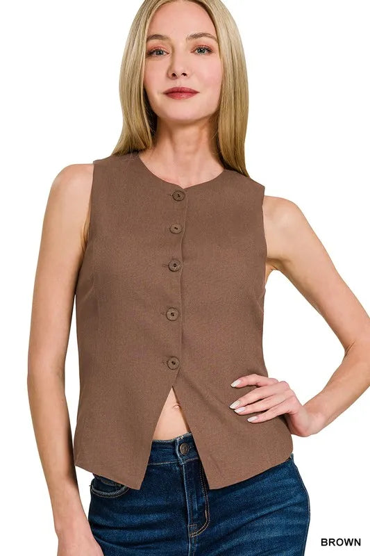 Zenana Chasing Perfection Linen Button Down Vest in Brown