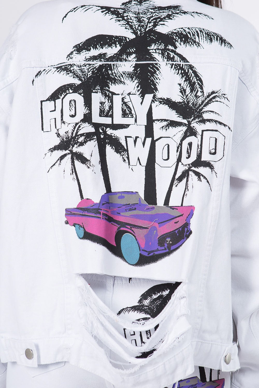 American Bazi Lights, Camera, Fashion Graphic Distressed Long Sleeve Denim Jacket